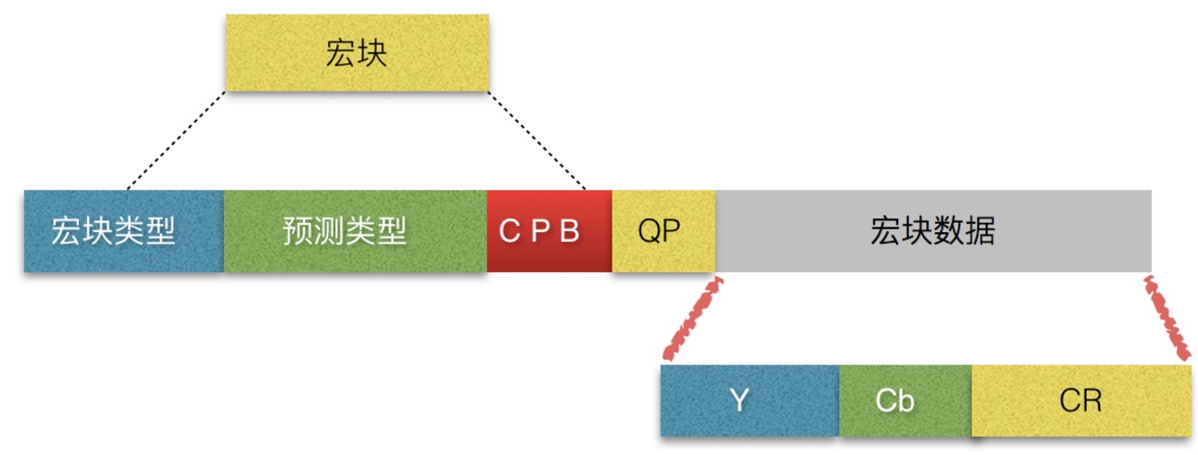 宏块是视频信息的主要承载者。一个编码图像通常划分为多个宏块组成.包含着每一个像素的亮度和色度信息。视频解码最主要的工作则是提供高效的方式从码流中获得宏块中像素阵列。一个宏块 = 一个16*16的亮度像素 + 一个8×8Cb + 一个8×8Cr彩色像素块组成。(YCbCr 是属于 YUV 家族的一员,在YCbCr 中 Y 是指亮度分量,Cb 指蓝色色度分量,而 Cr 指红色色度分量)