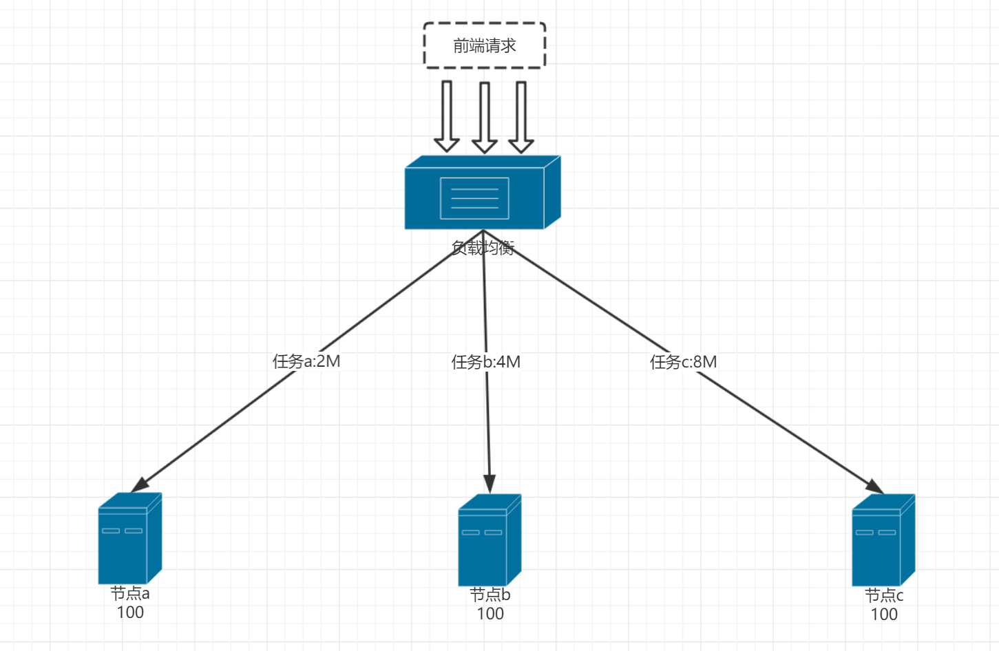 这种场景下任务启动时没有延时。但由于每个任务大小不一样轮询,哈希,随机就也就不再适应了。因为这几种算法适用于请求数量很大,任务大小差别不大的情况。也就是样本数足够大,样本基本一致才能保证这些样本均匀的分布在节点上。但也仅仅只是保证了每个节点上的样本数量均匀分布,倘若每个样本的所占用的资源不一样。那么这种均匀分配实际并不会使服务器的节点能够均匀的负载,达不到负载均衡的效果。那么这样的场景下,只平均负载的算法能够适用与这种场景。平均负载算法是在每次派发任务时,会收到节点反馈过来的负载情况,然后根据每个节点的负载情况,选择负载最小的节点派发任务。下面以图来说明这两种情况,如下图