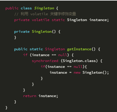 有序性:是因为 instance = new Singleton(); 不是原子操作。编译器存在指令重排,从而存在线程1 创建实例后(初始化未完成),线程2 判断对象不为空,但实际对象扔为空,造成错误。