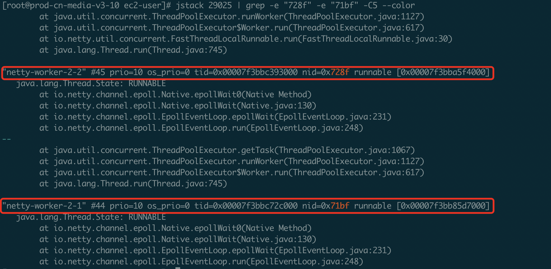 jstack 29025 | grep -e “728f” -e “71bf” -C5 —color