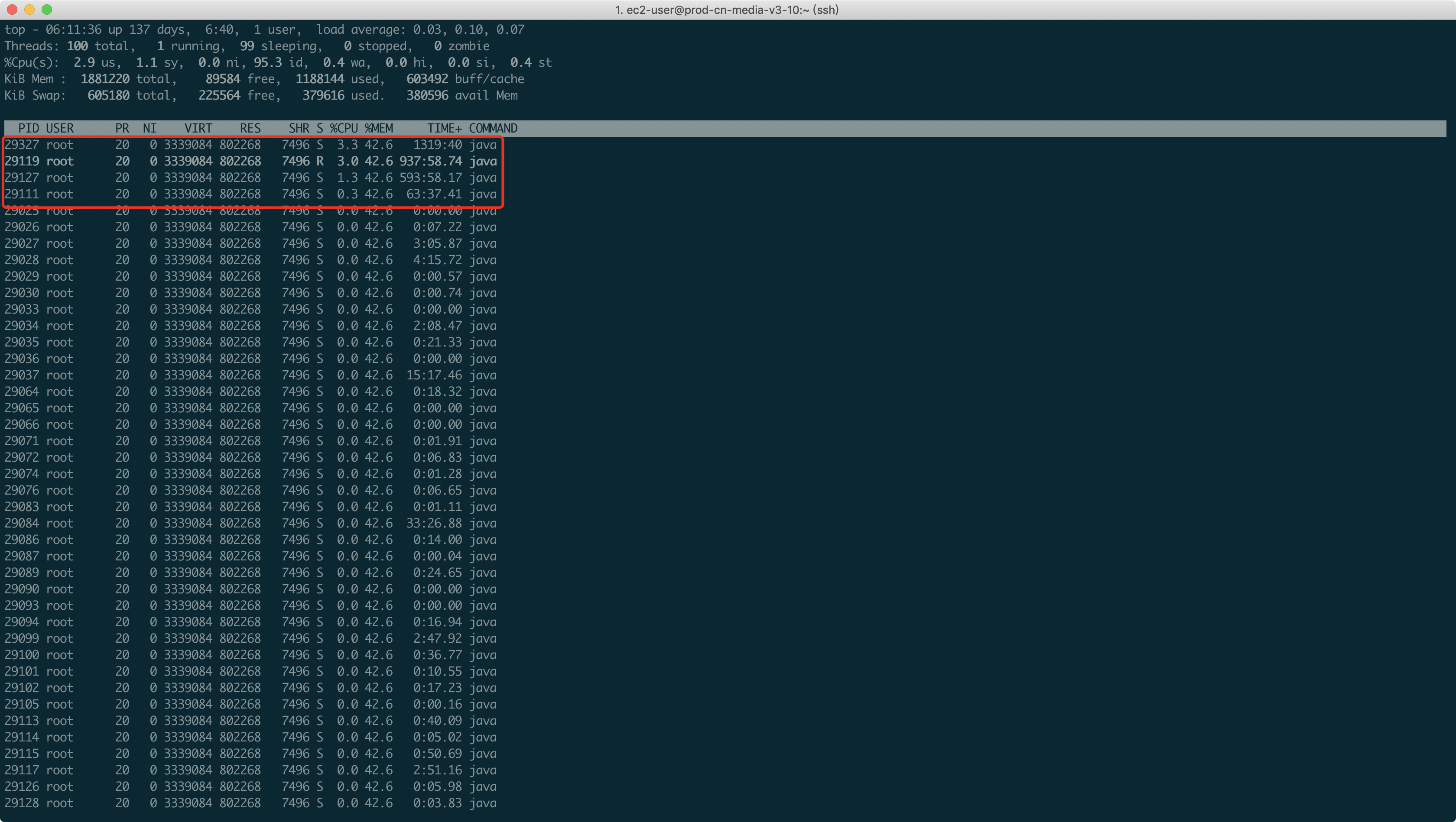 如图 进程29025 最耗cpu的线程pid是29327,29119