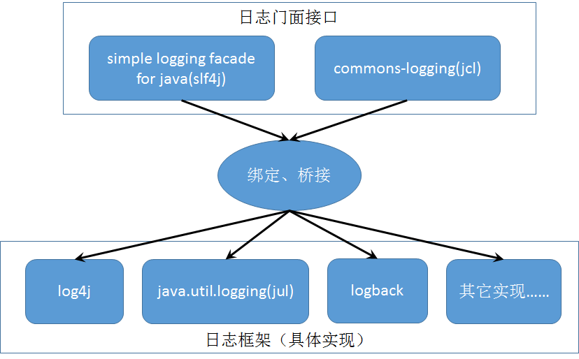 日志门面接口本身通常并没有实际的日志输出能力,它底层还是需要去调用具体的日志框架API的,也就是实际上它需要跟具体的日志框架结合使用。由于具体日志框架比较多,而且互相也大都不兼容,日志门面接口要想实现与任意日志框架结合可能需要对应的桥接器,就好像JDBC与各种不同的数据库之间的结合需要对应的JDBC驱动一样。